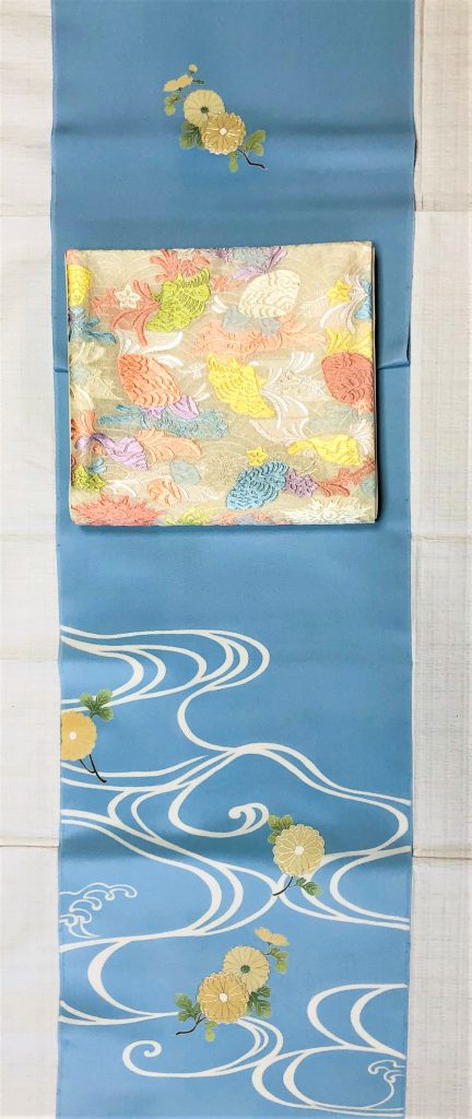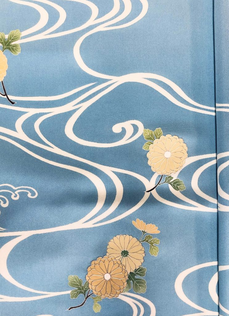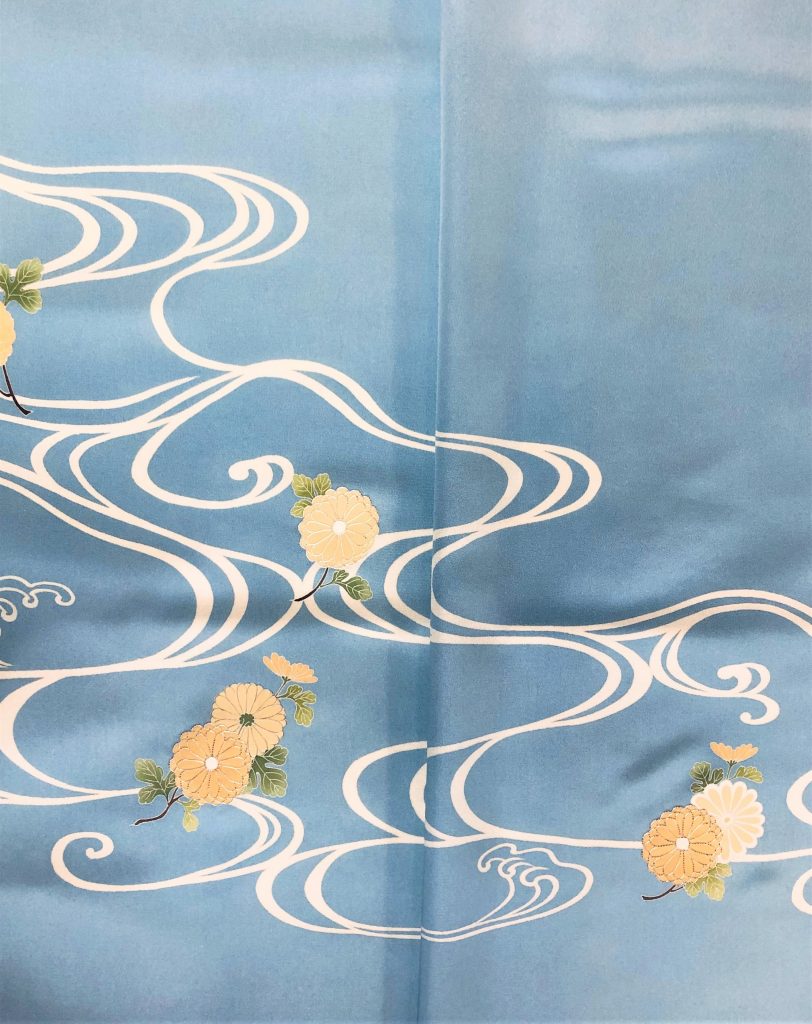 爽やかな地色に古典柄の菊水、流れるように菊が配置してあります。