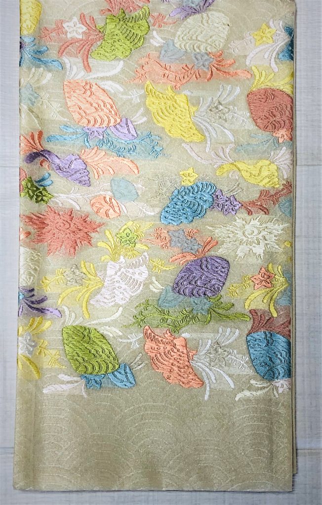 白地の袋帯は三本紗という織に色とりどりの貝が散りばめてあります。