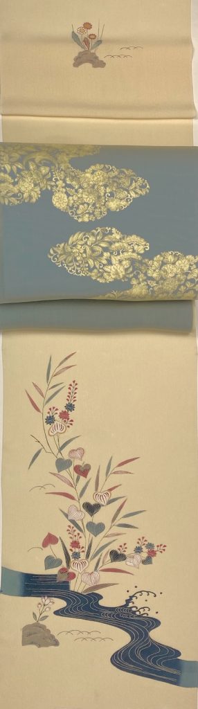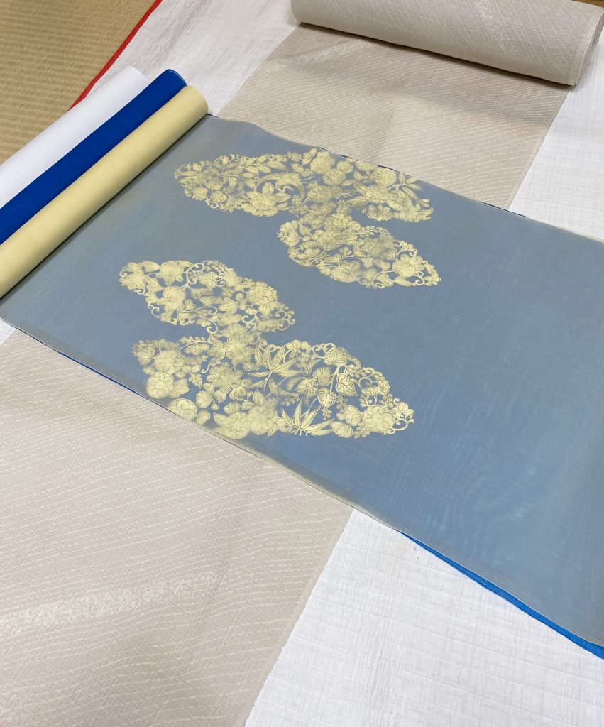下地に濃い目のブルー地に摺箔雲取り、上に黄色の無地を重ねてます。