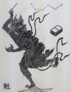 魁星の「魁」という字はこの「斗」と「鬼」からなっているので、「魁星」は画像のように鬼が斗(=升)を抱えてたり蹴り上げたりしている、漢字の形通りの姿で祀られています。学問の神様ですから手には筆も持ってます。