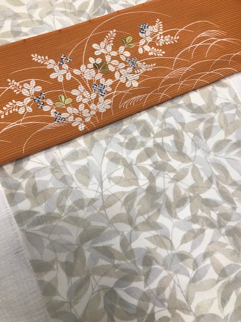 写真は小紋粋紗のような風合いに葉だけを型染めしています。