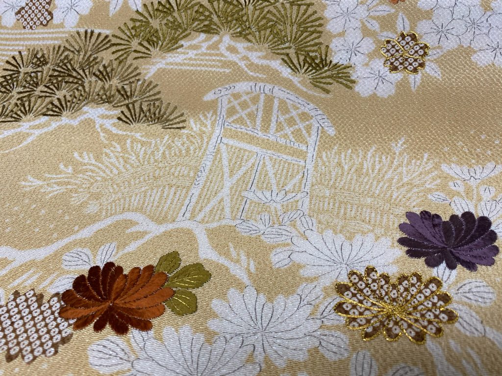 御所解 枝折戸、落ち着いた色目ですが縫いの力強さを感じていただける仕上がりです。