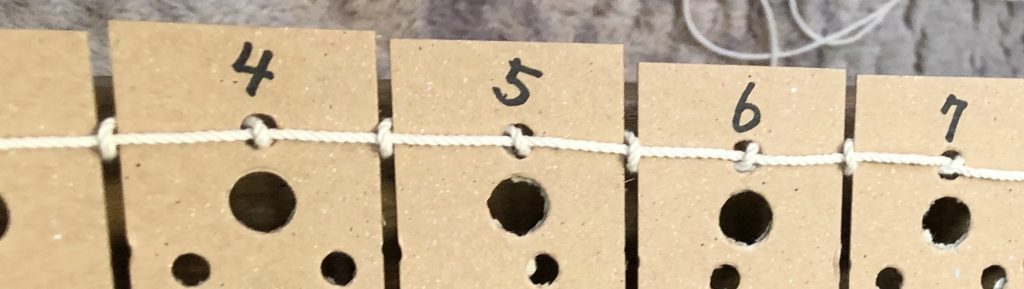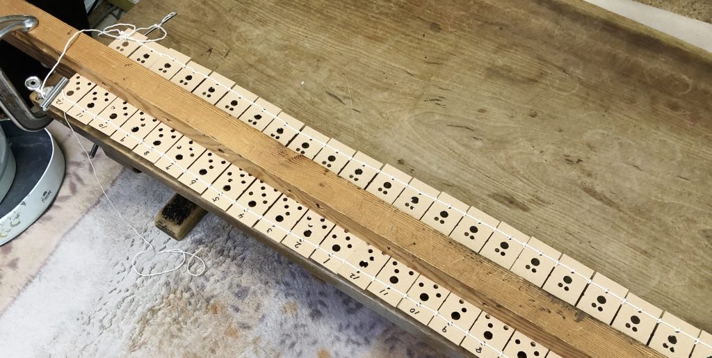 紋紙に穴をあけられたら、紋紙を編む作業に移ります。編みたい紋紙を水平に並べ木で固定します。そして上下にあけた穴にタコ糸を通します。