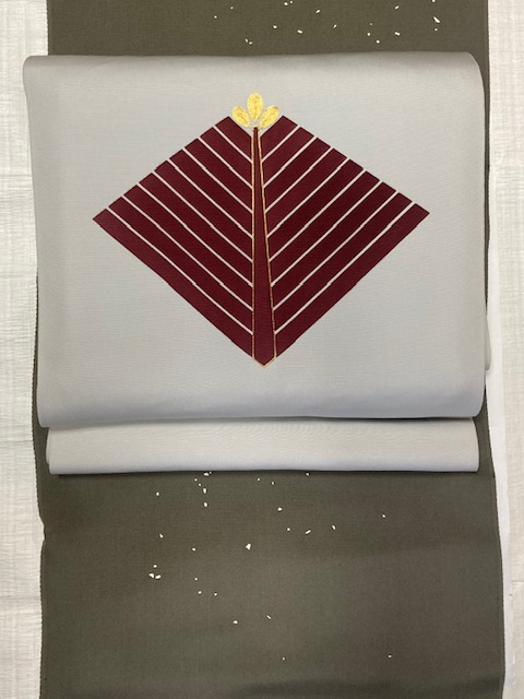 深いオリーブ地のまき糊の着物と明るいグレー地の染帯、