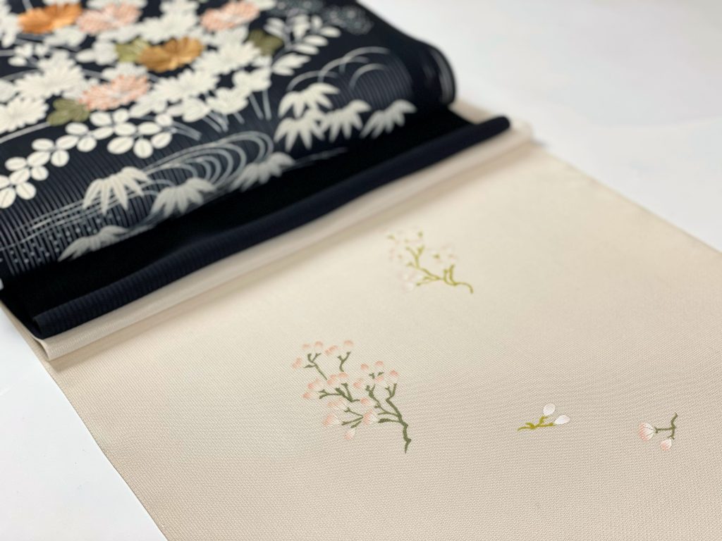 この御所解染帯は通常紫を入れている刺繍の箇所に藍色を入れて仕上げてあるレアな1本です。