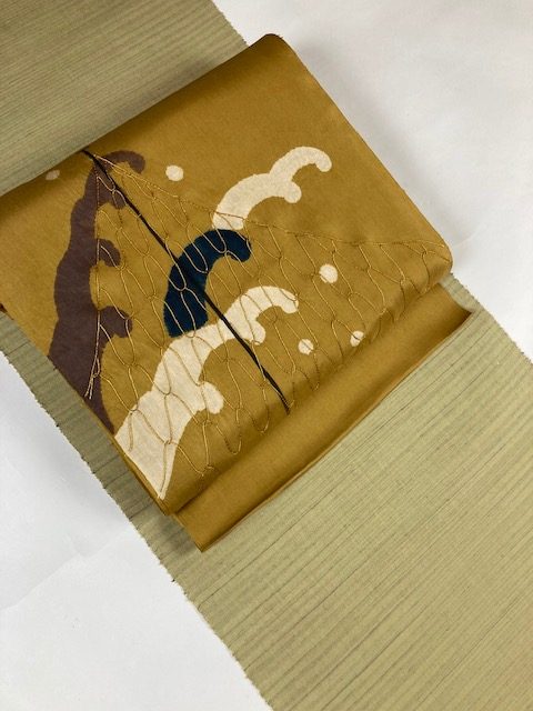 写真は五月の着物と帯に掲載した「紬に染め帯」です。