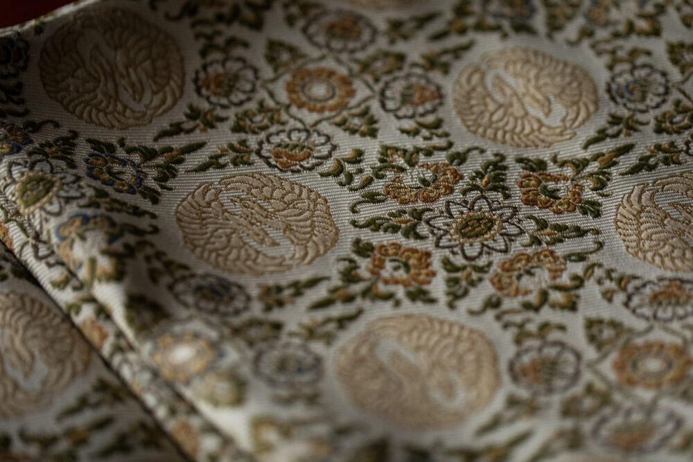 因みに現在の袋帯は19世紀(1801年)、フランスの発明家ジョゼフ・マリー・ジャガードが自動織機、「ジャガード織」を発明し、その後ようやく昭和初期から日本でも袋帯の生地として織り出され、現在の唐織(からおり)などが市場に出まわるようになる。